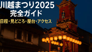 観光 川越まつり2025を120%楽しむ!日程・見どころ・屋台・アクセス・駐車場ガイド 秋の訪れとともに、街中がにぎわいと提灯の灯りで彩られる「川越まつり」。2025年も、江戸情緒あふれる山車の曳っかわせや、美味しい屋台グルメが楽しめる季節がやってきます。この記事では、「川越まつり2025」の開催日程や時間、会場の場所、屋台・... 観光